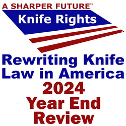 - Federal Switchblade Act: In June Knife Rights’ federal lawsuit challenging the constitutionality of significant portions of the Federal Switchblade Act on Second Amendment grounds was dismissed without prejudice on standing grounds. An entirely new lawsuit was filed in September. Motion for Summary Judgement was filed in November. Oral arguments are likely to be scheduled in March or April. Meanwhile we will shortly have a new U.S. Attorney General who may be less interested in opposing this Second Amendment lawsuit and, perhaps, coming to a swift resolution.