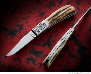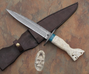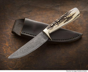 | Custom Larry Pridgen Damascus Carved Stag Fighter donated by Pridgen Custom Knives