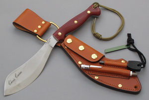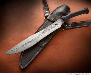 | Custom James Helm Sinuous Bush Sword donated by Helm Enterprises, Forging Division with Luke Swenson Custom Sheath and Baldric Carry Rig donated by Swenson Knives